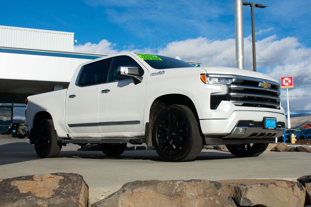 *One Owner*, Accident Free Carfax, Alloy Wheels, Audio Package, Backup Camera, Bi Xenon Headlamp Package, Bluetooth, Bose High End Sound Package, Cargo Package, Climate Package, Heat Package, Heavy Duty Trailer Package, Memory Package, Multimedia Package, Navigation System, Off Road Package, Performance Handling Package, Power Mirror Package, Power Package, Premium Audio Package, Premium Wheels, Rear Climate Package, Remote Start, Safety Package, Security Package, Sunroof/Moonroof, Technology Package, Tow Package, Wood Trim Package, Silverado 1500 High Country, 4D Crew Cab, 3.0L I6, 10-Speed Automatic, 4WD, Crystal White Tricoat, Jet Black/Umber Leather, 10-Way Power Driver Seat w/Lumbar, 10-Way Power Passenger Seat Adjuster w/Lumbar, 12.3" Multicolor Reconfigurable Digital Display, 120-Volt Bed Mounted Power Outlet, 120-Volt Interior Power Outlet, 15" Diagonal Multicolor Head-Up Display, 170 Amp Alternator, 2 USB Data Ports, 220 Amp Alternator, 2nd Row Heated Outboard Seats, 3.23 Rear Axle Ratio, 4-Wheel Disc Brakes, 7 Speakers, ABS brakes, Adaptive Cruise Control, Adaptive Ride Control Suspension, Air Conditioning, AM/FM radio: SiriusXM with 360L, Apple CarPlay/Android Auto, Auto High-beam Headlights, Auto-dimming door mirrors, Auto-Dimming Inside Rear-View Mirror, Auto-dimming Rear-View mirror, Auto-Locking Rear Differential, Automatic temperature control, Bed View Camera, Bluetooth® For Phone, Body-Color Painted Mirror Caps, Bodyside moldings, Brake assist, Bumpers: body-color, Chevytec Spray-On Black Bedliner, Chrome Assist Steps, Chrome Recovery Hooks, Color-Keyed Carpeting Floor Covering, Compass, Deep-Tinted Glass, Delay-off headlights, Driver door bin, Driver Memory, Driver vanity mirror, Dual Exhaust w/Polished Outlets, Dual front impact airbags, Dual front side impact airbags, Dual Rear USB Ports (Charge Only), Electric Rear-Window Defogger, Electronic Stability Control, Electronic Transmission Range Selector Shifter, Emergency communication system: OnStar, Engine Block Heater, Enhanced Automatic Emergency Braking, Floor Mounted Center Console, Following Distance Indicator, Forward Collision Alert, Front anti-roll bar, Front Bucket Seats, Front Carpeted Floor Mats, Front Center Armrest, Front dual zone A/C, Front fog lights, Front LED Fog Lamps, Front Pedestrian Braking, Front Rain-Sensing Wipers, Front reading lights, Front wheel independent suspension, Fully automatic headlights, Garage door transmitter, Genuine wood console insert, Genuine wood dashboard insert, Genuine wood door panel insert, HD Surround Vision, Heated door mirrors, Heated Driver & Front Outboard Passenger Seats, Heated front seats, Heated rear seats, Heated Steering Wheel, Heated steering wheel, High Capacity Suspension Package, Hitch Guidance, Hitch Guidance w/Hitch View, Illuminated entry, In-Vehicle Trailering System App, Integrated Trailer Brake Controller, IntelliBeam Automatic High Beam On/Off, Keyless Open &